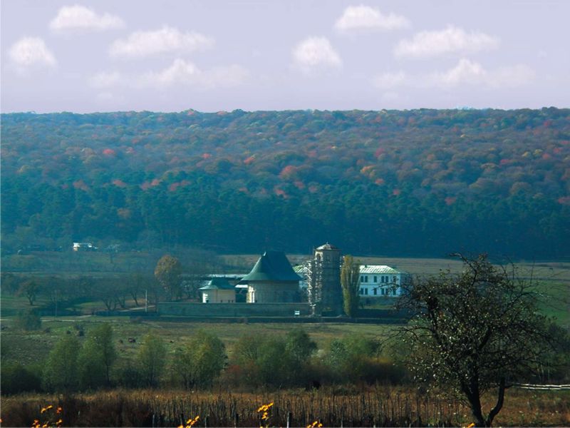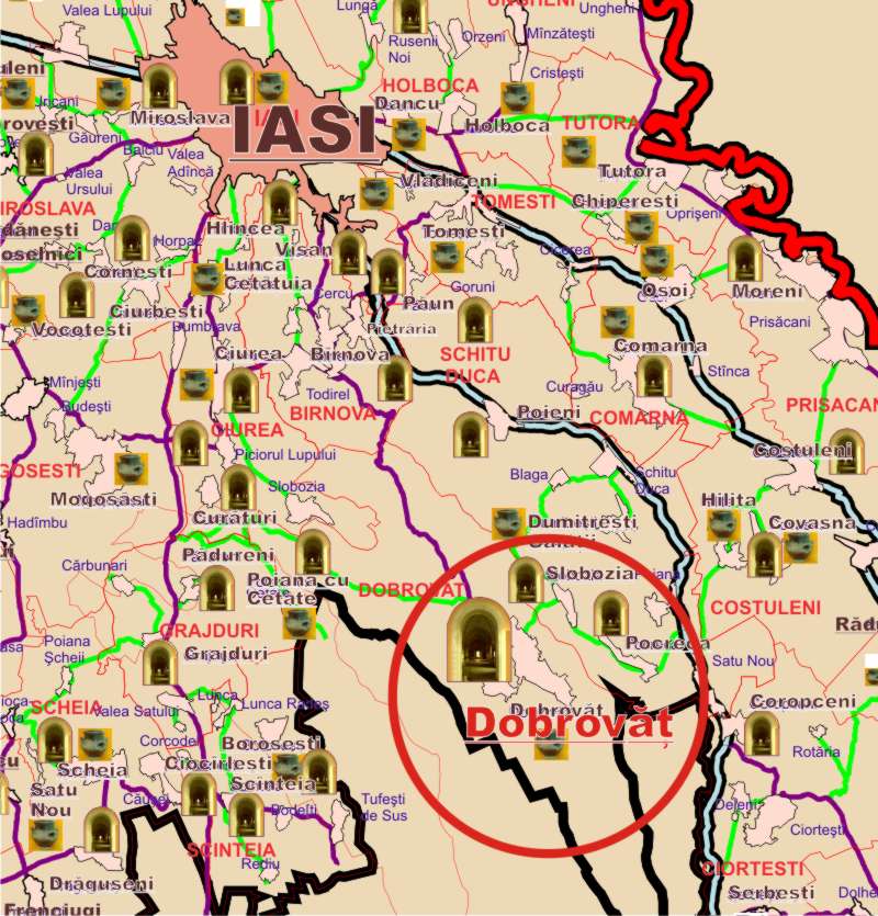 Situat la intrarea în incinta mănăstirii Sf. Duh din Dobrovăţ-Ruşi.