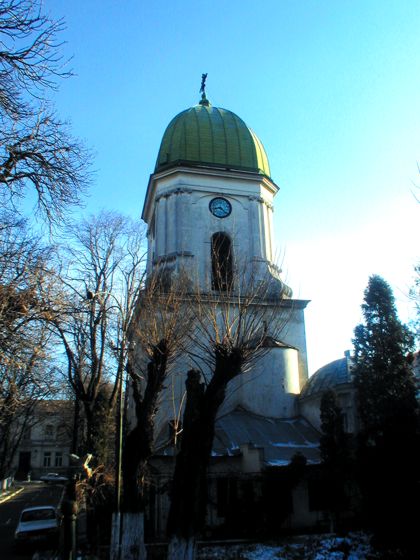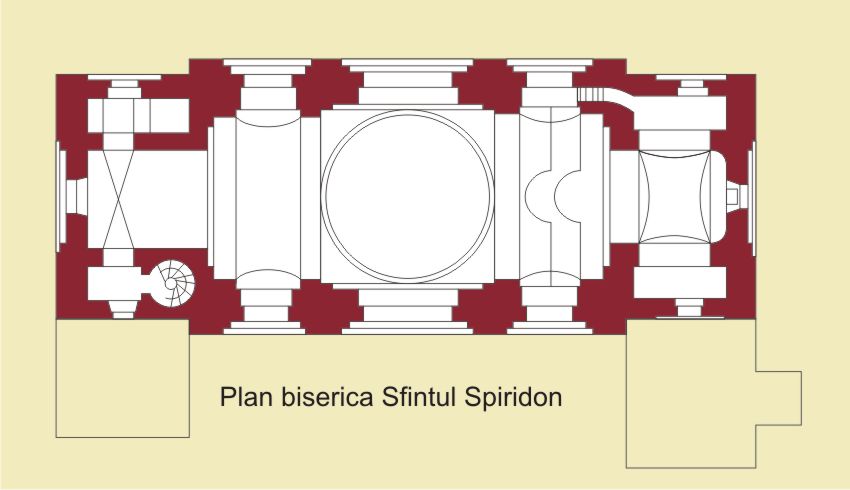 - Cupola turnului avea la începuturi o formă bulbară de model rus(Caproşu: 387). A fost însă modificată în 1862, constructorii fiind influenţaţi, se spune, de pălăria de papură purtată de Sf. Spiridon în icoanele care îl reprezintă. În limba greacă, „Spiridon” înseamnă „coşuleţ împletit din nuiele”, ceea ce i-ar fi inspirat cumva pe iconari. Este deci o convenţie grafică, fără nici o legătură cu hagiografia respectivuli sfânt(Iftimi: 118).